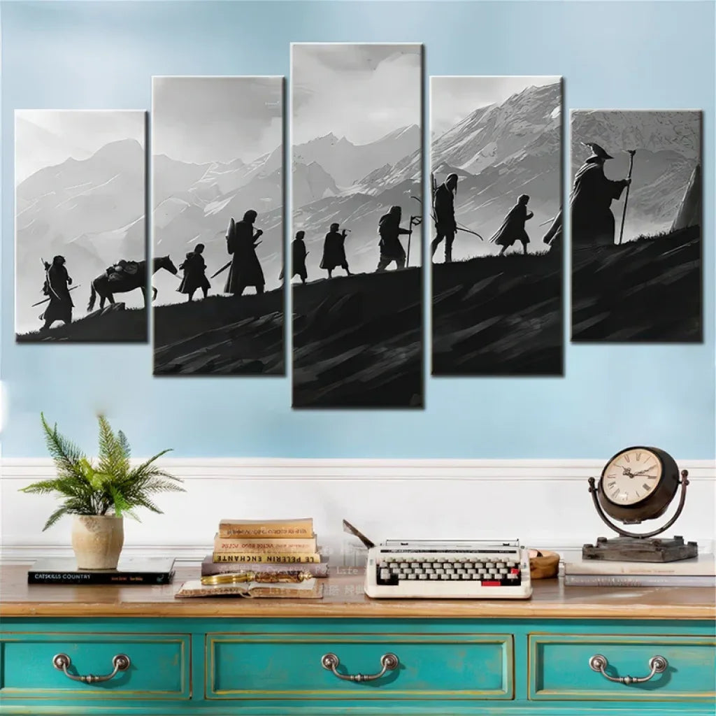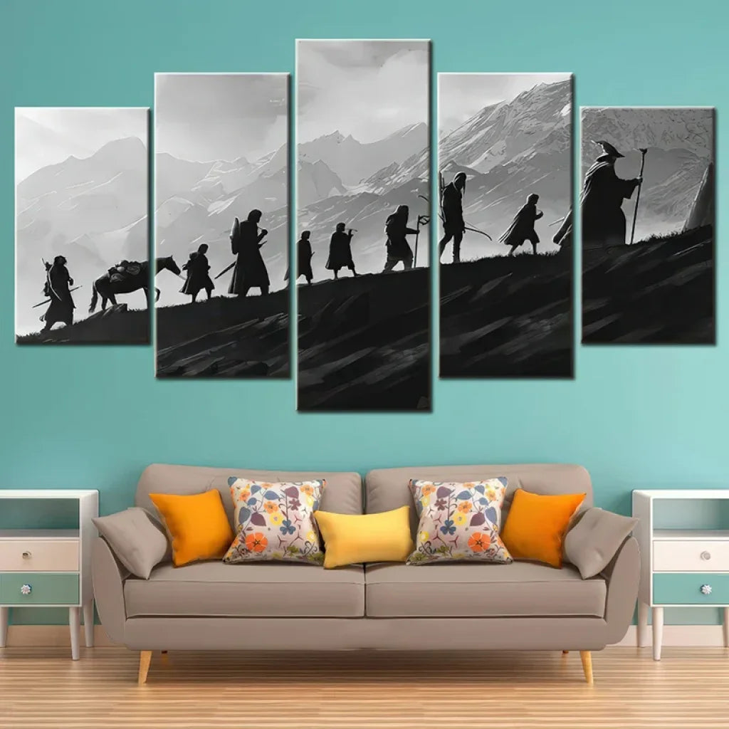 Transportez la Terre du Milieu chez vous ! Sur ce tableau 5 parties, vous verrez Frodon et ses 8 compagnons, qui sont en pleins périples : Place à l’aventure ! Le paysage est bien dessiné, nos aventuriers traversent vents et montagnes.