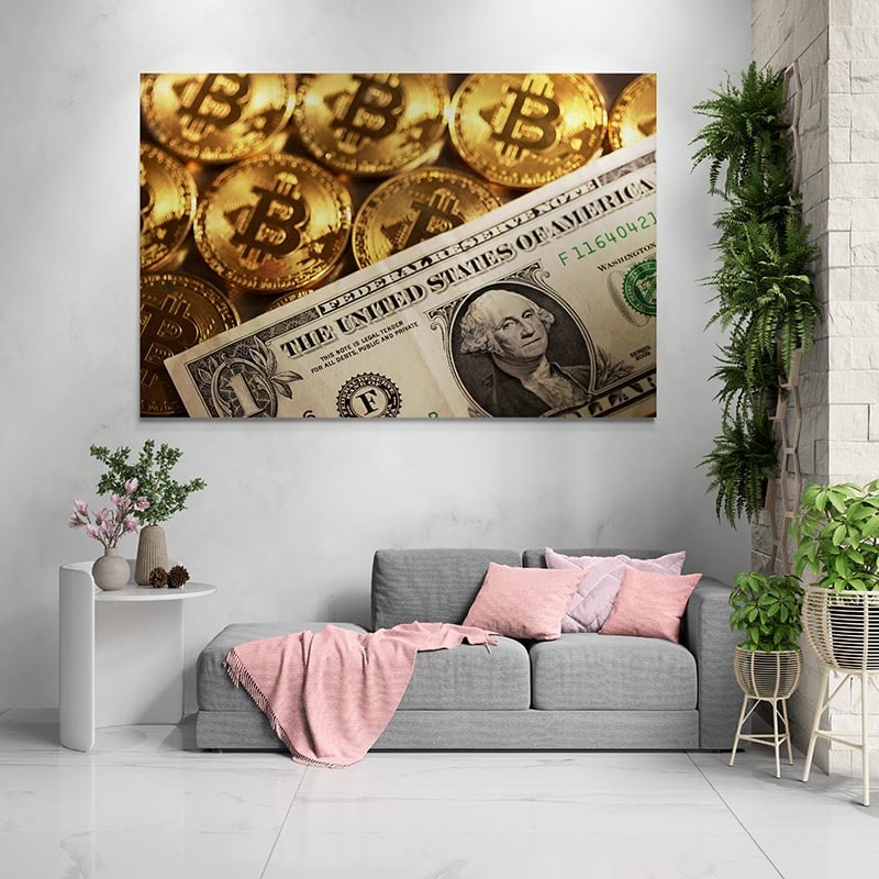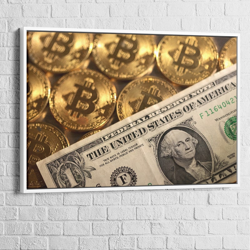 Le tableau présente une juxtaposition fascinante entre les bitcoins dorés et un billet de un dollar américain. Les détails minutieux et la qualité d'impression exceptionnelle font ressortir chaque élément, créant ainsi un effet visuel puissant. Le Bitcoin, symbole de l'ère numérique, rencontre ici le dollar, emblème de l'économie traditionnelle, pour former une œuvre d'art pleine de sens et de dynamisme.