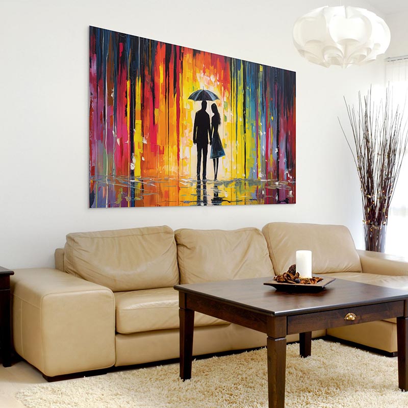 Le tableau Évasion Romantique capture la beauté d’un moment intime et unique : un couple marchant main dans la main sous un parapluie, au milieu d’une pluie de couleurs vibrantes. Les couleurs chaudes – rouges, jaunes et oranges – contrastent magnifiquement avec les teintes plus sombres et mystérieuses de la silhouette des personnages. Cette œuvre transporte une atmosphère à la fois paisible et intense, idéale pour ceux qui cherchent à ajouter une touche de poésie et de dynamisme à leur intérieur.