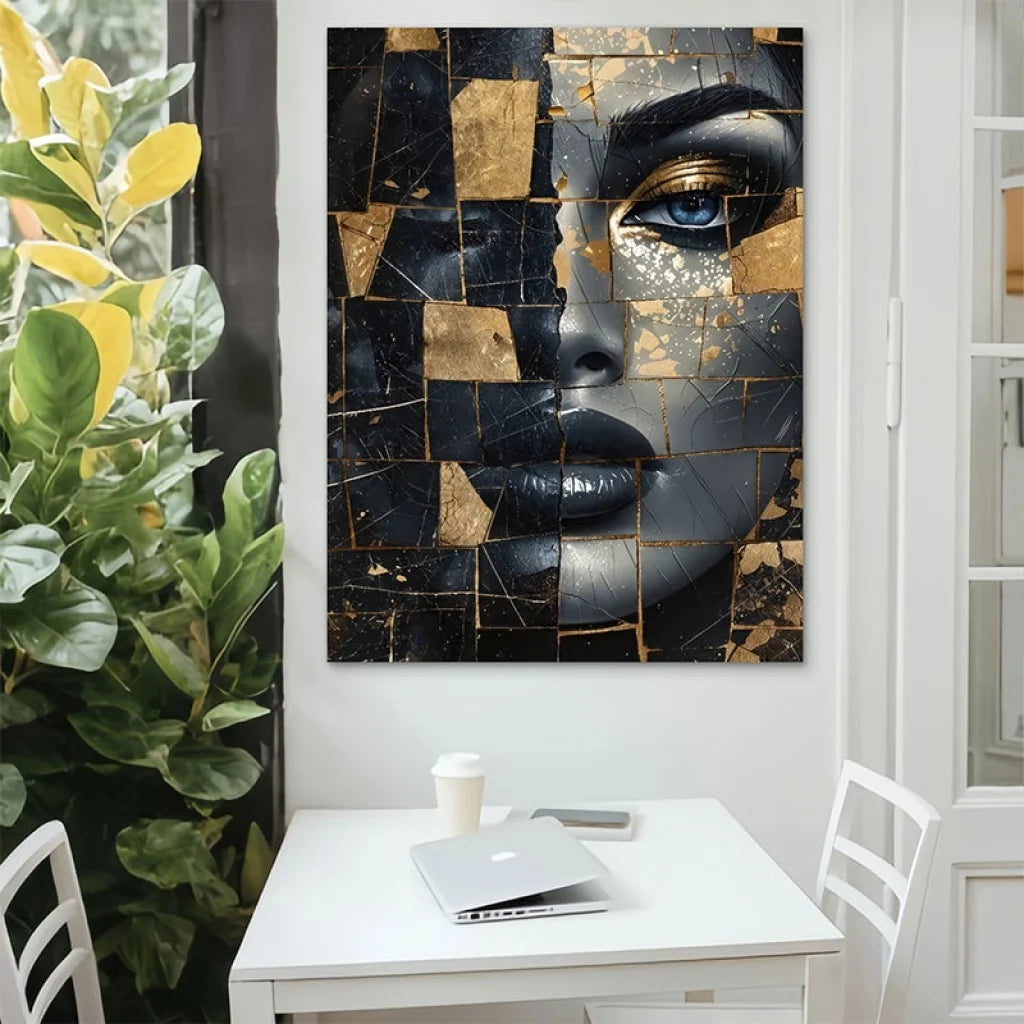 Le Tableau Femme Beauté Fragmentée incarne à la perfection la rencontre entre le luxe et l’émotion. Cette femme mystérieuse, partiellement dissimulée derrière des éclats sombres et dorés, évoque la dualité entre force et fragilité, éclat et silence, beauté et complexité.