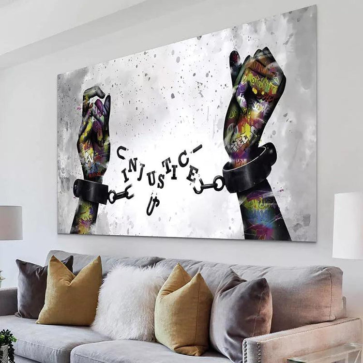 "Injustice" est un tableau de street art représentant des mains colorées brisant les chaînes de l'injustice. Les mains sont peintes avec des graffitis et des tags, donnant à l'œuvre un caractère vibrant et dynamique. L'arrière-plan est une toile de tons blancs et gris, permettant aux couleurs vives de ressortir avec une intensité frappante.