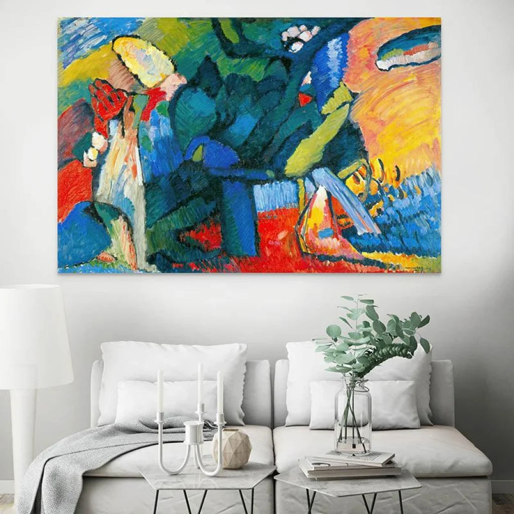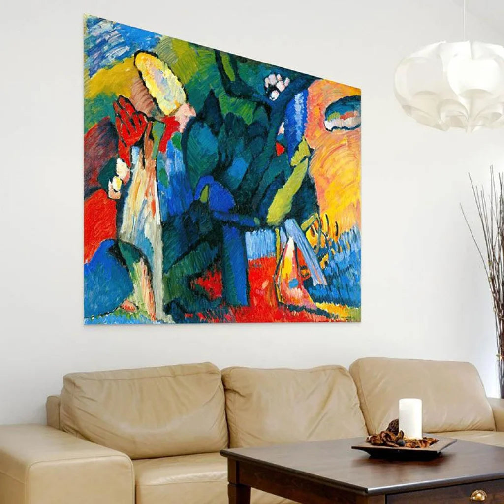 Chaque coup de pinceau sur cette reproduction d'œuvre d'art est un mot dans le récit visuel qu'a composé Kandinsky. L'interaction des couleurs et des formes crée une narration abstraite qui invite à l'interprétation personnelle et à l'immersion sensorielle.
