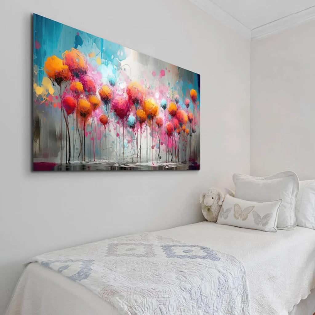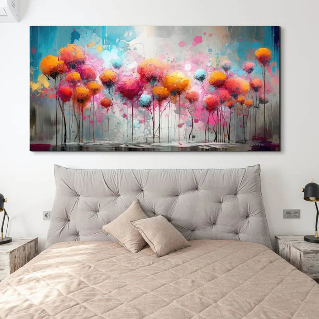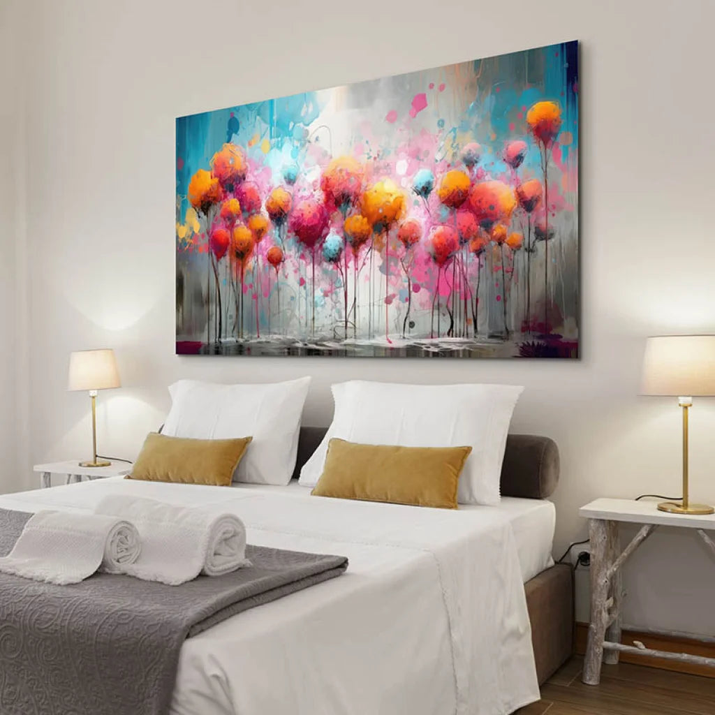 Dette maleri "Mystical Garden" er en visuel rejse gennem et imaginært landskab. De abstrakte former minder om træer eller blomster, der hænger i en fantasiverden, hvor farverne blander sig for at skabe en blød og fængslende atmosfære. Nuancernes rigdom og detaljernes subtilitet tilføjer en unik dybde, perfekt til at fange opmærksomhed og invitere til flugt. Dette farverige maleri blander sig let med forskellige interiørstilarter, fra moderne til boheme.