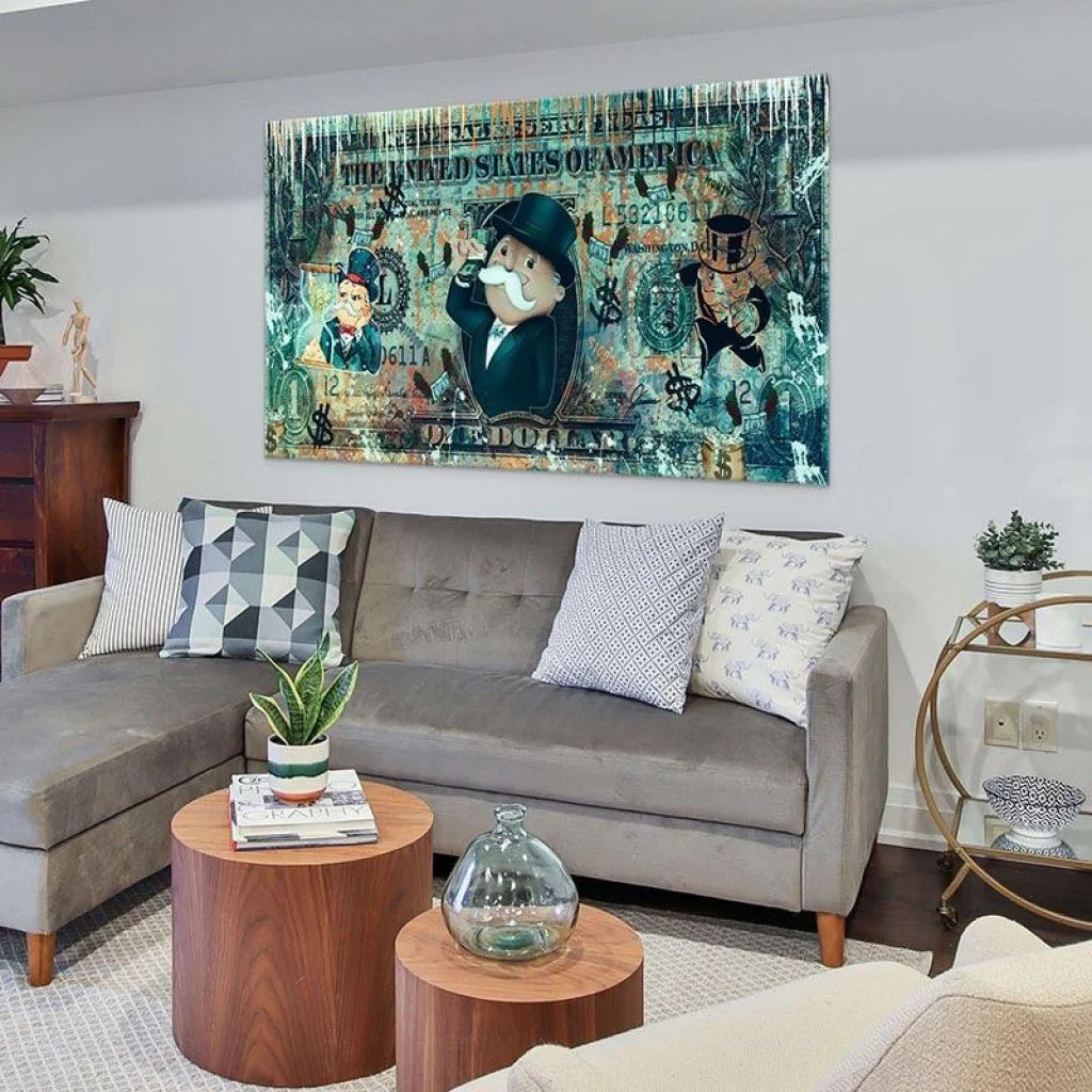 I midten af dette lærred optræder Monopolets emblematiske karakter, Mr. Monopoly, i al sin pragt, sublimeret af omhyggelige detaljer og en repræsentation rig på symbolik. Omgivet af grafiske elementer, der minder om pengesedler, inviterer dette dekorative stuemaleri til refleksion over penges værdi og æstetik i et nutidigt samfund.