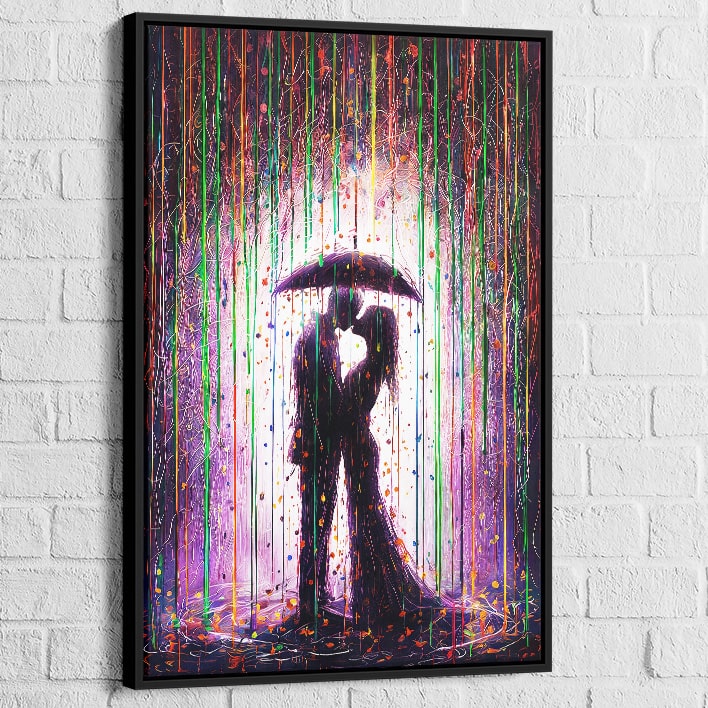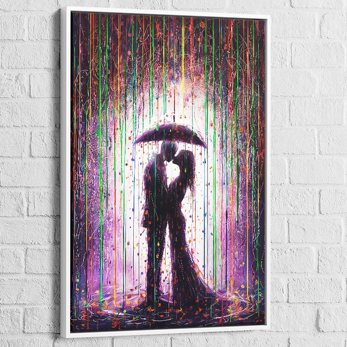 Dyk ned i en verden af romantik og livlige farver med Moderne maleri Kærlighed i regnen. Dette slående værk fanger magien i et øjeblik, hvor to silhuetter omfavner sig under en byge af lysende og abstrakte nuancer. Perfekt til at skabe en varm og følelsesladet atmosfære, dette maleri forvandler dine vægge til et ægte moderne kunstgalleri.