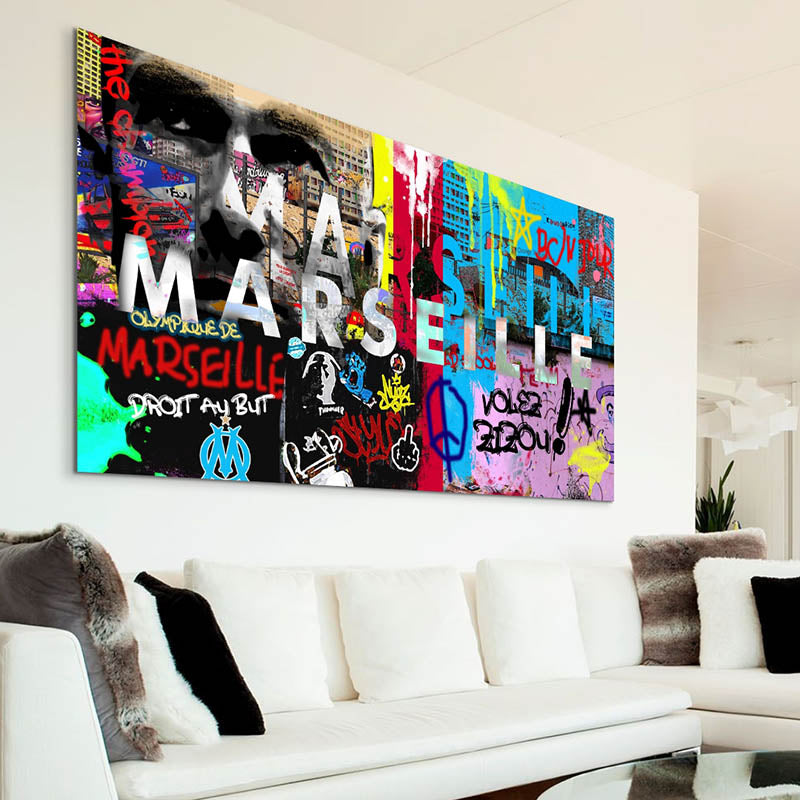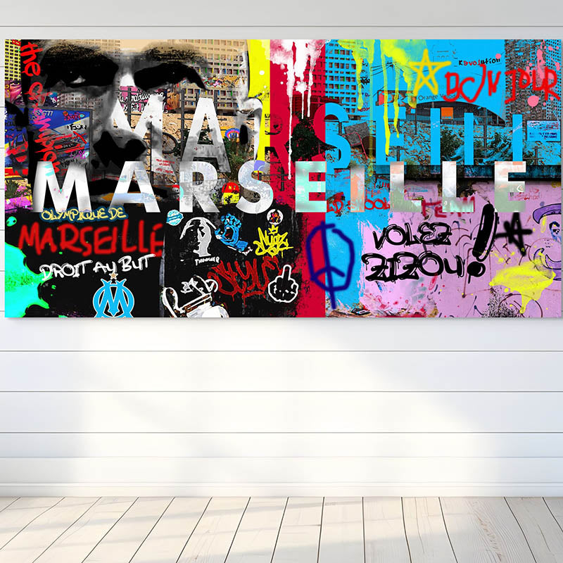Med livlige farver, urban graffiti og ikoniske elementer fra Marseille, fanger dette maleri byens vitalitet. Den passer perfekt ind i forskellige interiørstile: