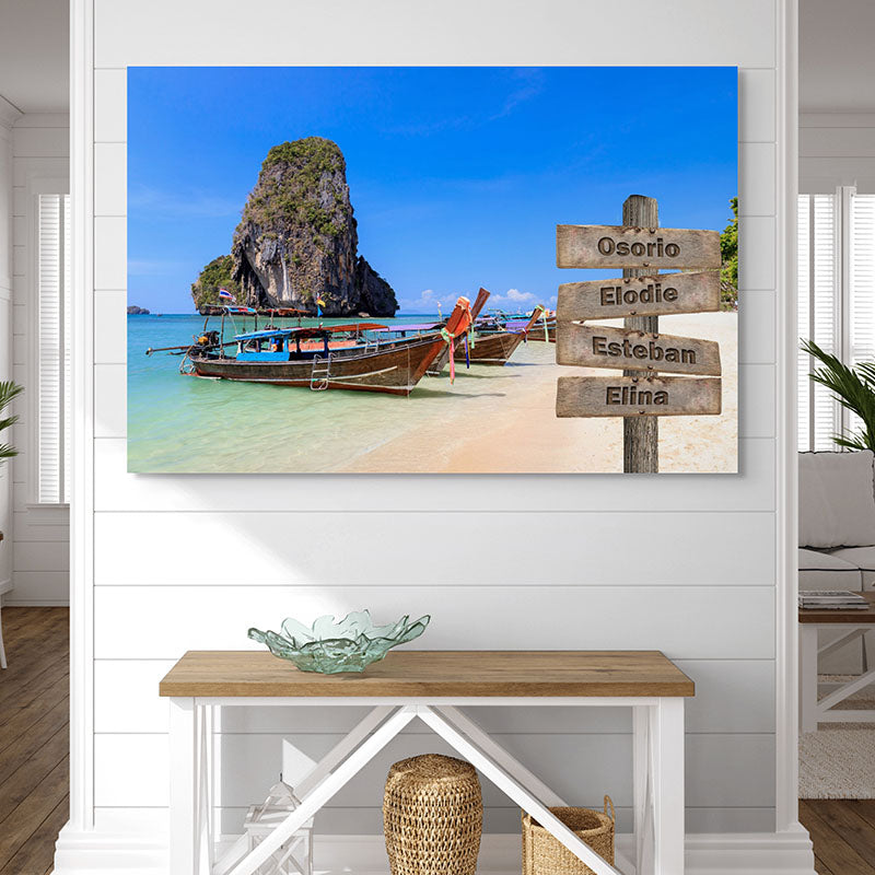 Forvandl dit interiør med en personlig fornavnstabel inspireret af Thailands himmelske strande. Ideelt til at tilføje et strejf af flugt og autenticitet til din indretning, dette maleri giver dig mulighed for at vise fornavnene på dine kære på et træpanel integreret i billedet, som en ægte rejsesouvenir.