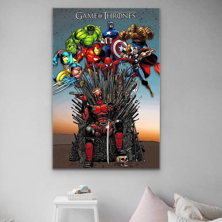 Forestil dig et øjeblik, at Marvel-superhelte beslutter sig for at erobre Westeros og sætte sig på den berømte jerntrone. Det er præcis, hvad dette usædvanlige maleri repræsenterer, som humoristisk og originalt smelter verdener sammen Marvel og af Game of Thrones. Oplev Avengers og andre ikoniske Marvel-helte, samlet omkring objektet for alle ønsker: Jerntronen!