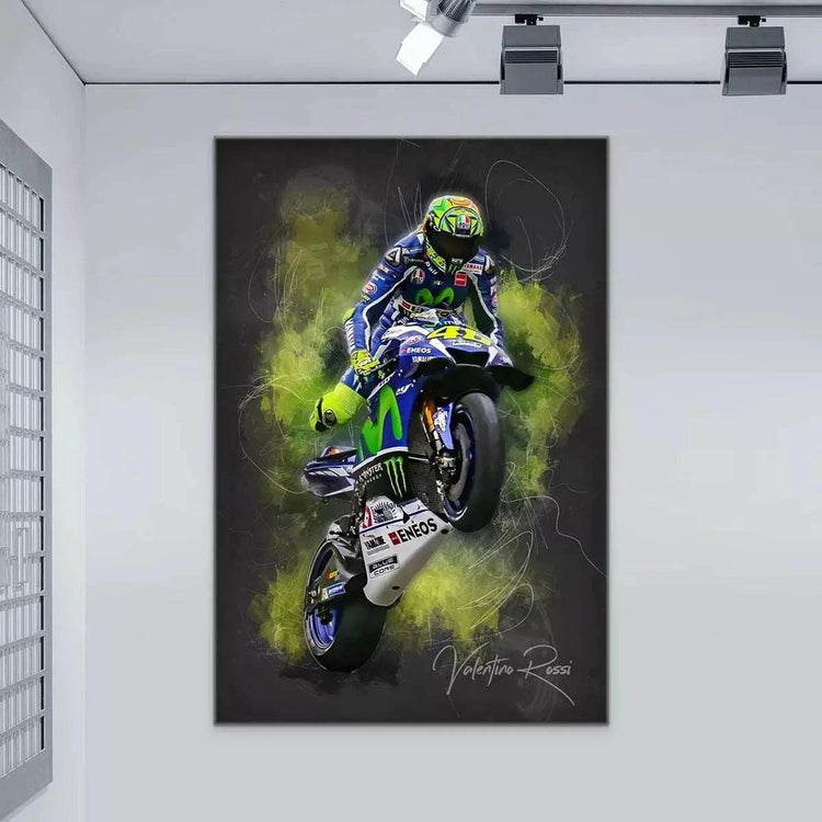 Dette maleri oversættes bogstaveligt talt som den perfekte blanding af kunst og interiørdesign. Det repræsenterer den berømte italienske chaufførs talent og ekspertise. Maleriet sporer Valentino Rossis glansår ombord på sin legendariske motorcykel. Baggrundsfarverne er overdådige med en unik og enestående fusion. I bunden af portrættet kan du se pilotens underskrift. Dette er et unikt blink, der gør maleriet så specielt.