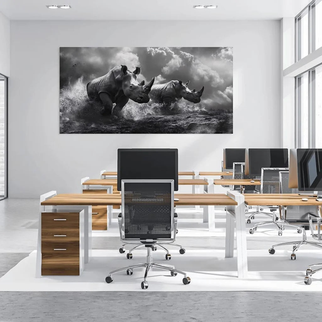 Wählen Sie ein Schwarzweiß-Gemälde als „Nashorn – Der Angriff“ Für die Wanddekoration müssen Sie sich für ein Stück entscheiden, das sowohl elegant als auch kraftvoll ist. Schwarz und Weiß ist eine zeitlose Wahl, die perfekt zu jedem Einrichtungsstil passt, egal ob modern, industriell oder minimalistisch.