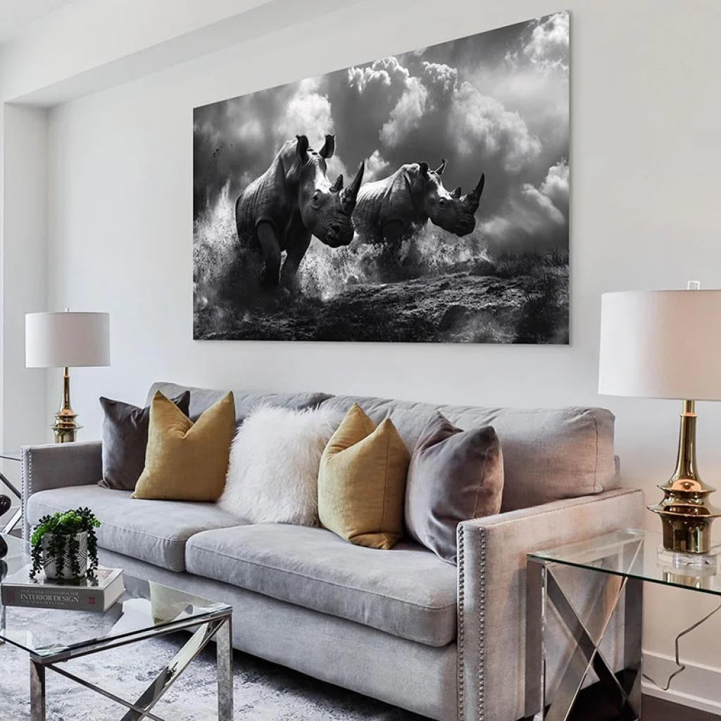 - Hochauflösender Druck: Jedes Detail, vom struppigen Fell der Nashörner bis zum stürmischen Himmel, wird dank des hochwertigen Drucks mit bemerkenswerter Präzision wiedergegeben.