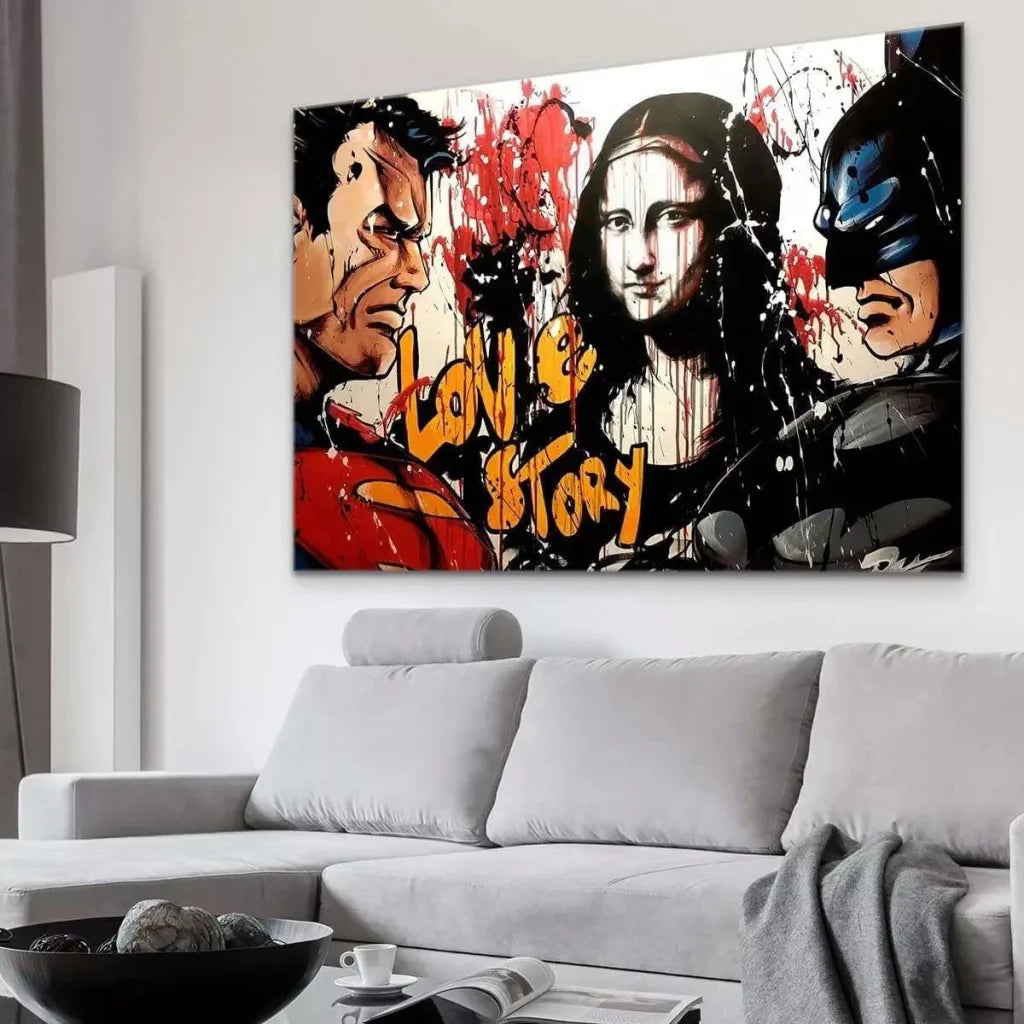Keine Graffiti mehr an den Außenwänden von Vorstadtgebäuden. Straßenkunst findet jetzt ihren Weg in unsere luxuriösesten Innenräume. Dieses Gemälde lässt Sie die Magie der Straßenkunst entdecken. Die einzige Grenze ist hier die Vorstellungskraft. Aus diesem Grund entdecken wir Comicfiguren wie Superman und Batman, die mit künstlerischen Meisterwerken wie der Mona Lisa illustriert sind. Die Ästhetik ist außergewöhnlich. Die Druckqualität liefert ein hochauflösendes Bild. An Ihren Wänden wird dieses Gemälde das Interesse Ihrer Gäste wecken.