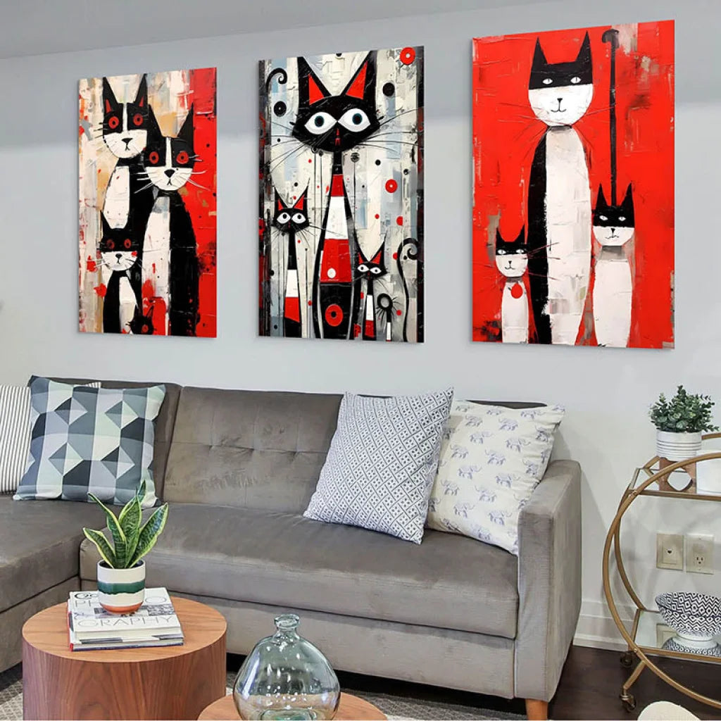 „Feline Trilogy“ ist ein Satz von drei eindrucksvollen Gemälden, die jeweils stilisierte Katzen in einer Mischung aus kräftigen Farben und klaren Linien zeigen. Diese Kunstwerke ziehen mit ihrem markanten Kontrast aus leuchtendem Rot, tiefem Schwarz und reinem Weiß sofort die Aufmerksamkeit auf sich und erwecken jede Katze auf einzigartige und faszinierende Weise zum Leben. Die ausdrucksstarken Augen und geometrischen Formen von Katzen verleihen Ihrer Inneneinrichtung eine spielerische und künstlerische Dimension.