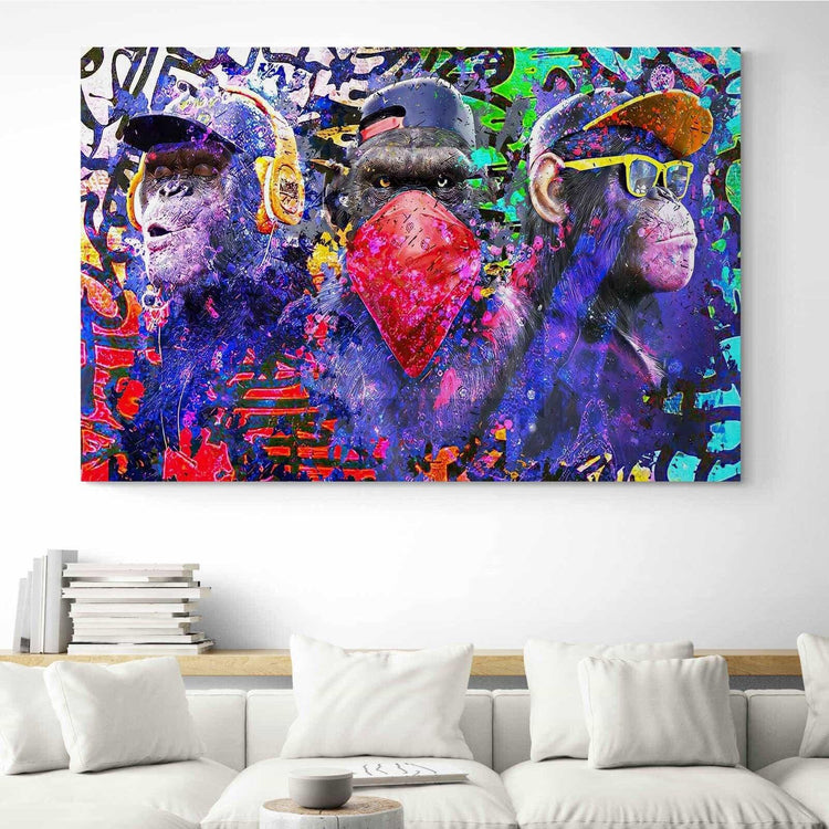 DER Affenmalerei Gangsta hebt sich durch die vielen darauf vorkommenden Farben von anderen Gemälden ab. Es gibt warme, aber auch kalte Farben, das heißt, der Großteil der Farben des sichtbaren Spektrums ist vorhanden. Wenn wir nun mehrere Farben sehen, beruhigt sich unser Gehirn automatisch und Farben haben einen guten Einfluss auf unsere Stimmung.