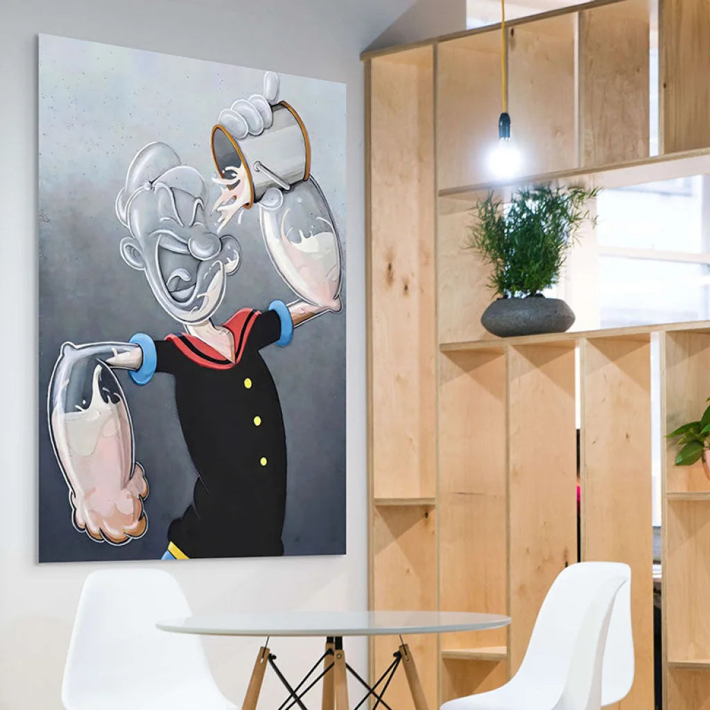 Avec ses bras gonflés, son sourire caractéristique et sa chope de bière à la main, ce Popeye version moderne dégage une énergie positive qui booste instantanément l’ambiance d’une pièce. -