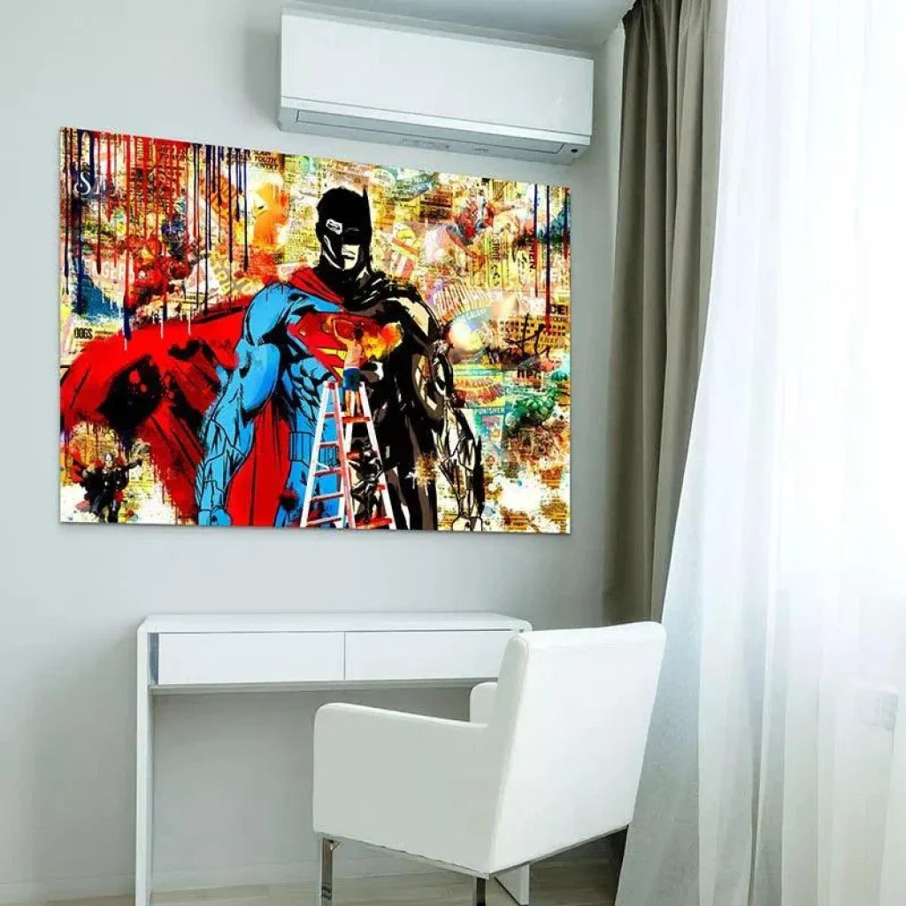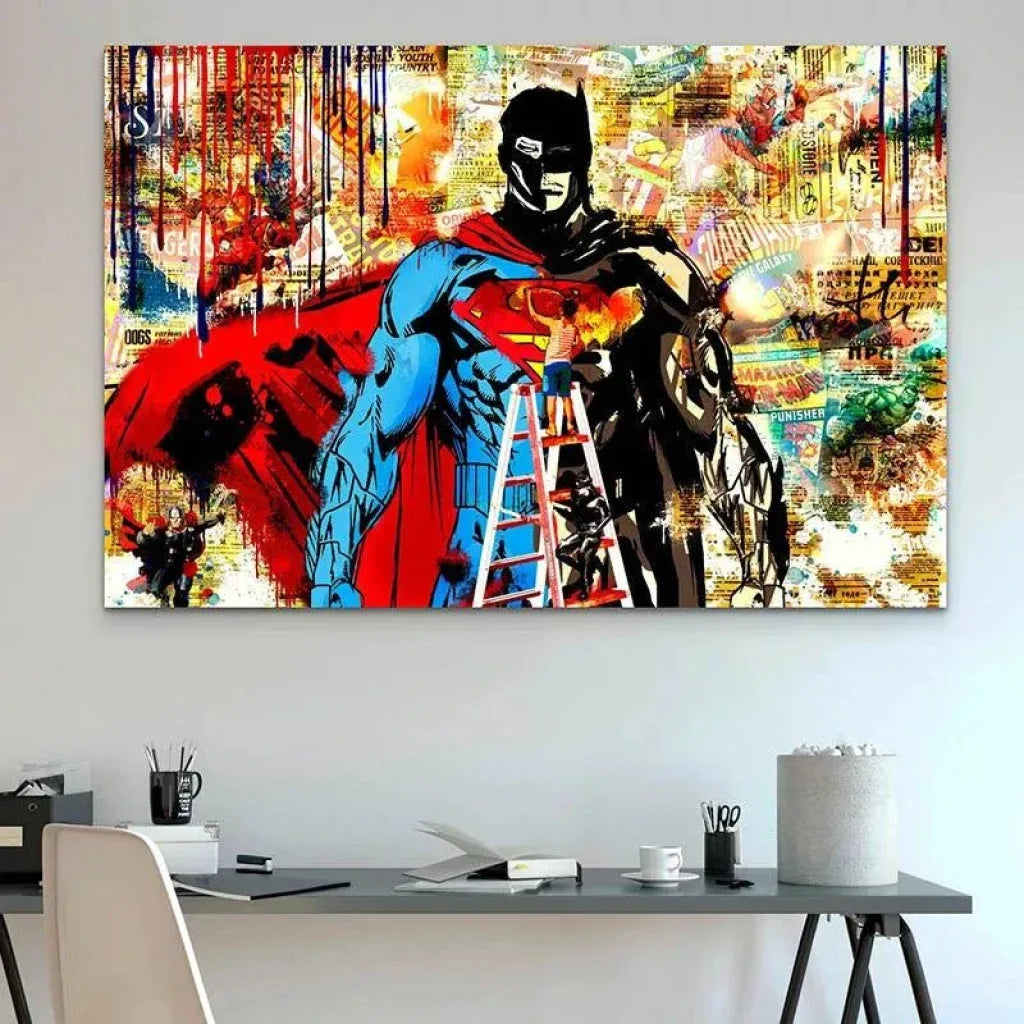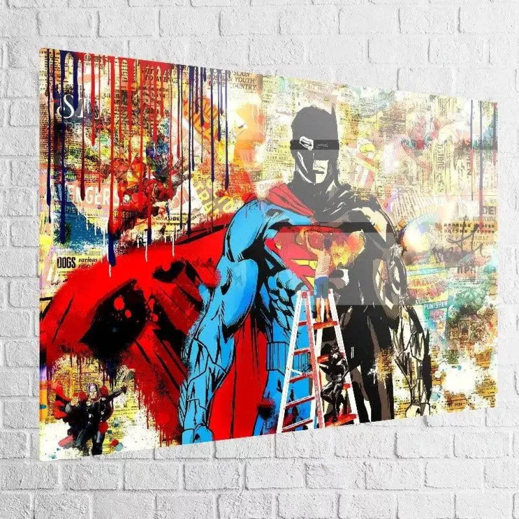 Unser Street-Art-Gemälde ist viel mehr als ein einfaches Dekorationsobjekt, es ist ein wahres Werk urbaner Kunst, das in Ihrem Interieur garantiert Eindruck macht. Mit seinem Tagger, der Superman und Batman kreiert, und seinem Hintergrund aus Ausschnitten aus Marvel und DC Comics ist dieses einzigartige Stück die perfekte Wahl für Fans von Straßenkunst und Popkultur.