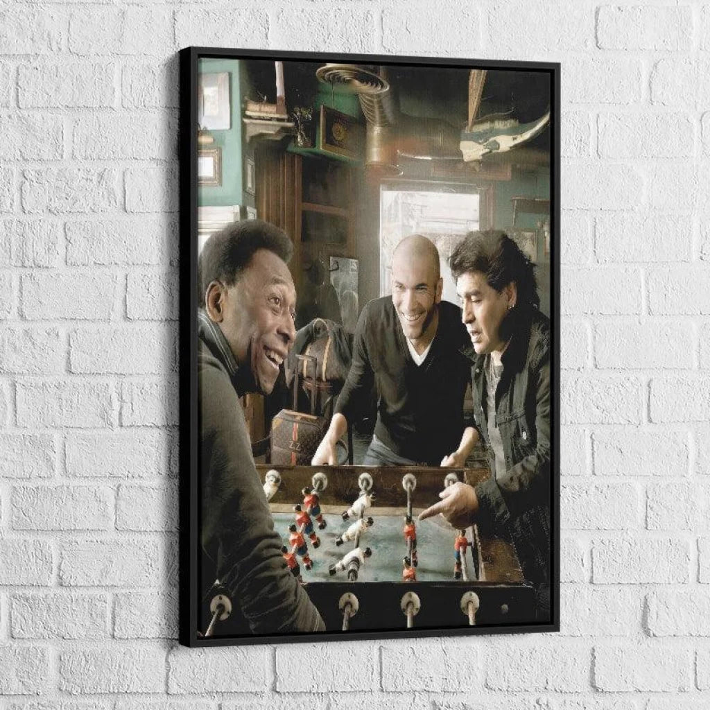 Bewundern Sie mit unserem Leinwandfoto „Fußballlegenden beim Tischfußball“ einen einzigartigen Moment der Fußballgeschichte. Dieses außergewöhnliche Foto zeigt Zinedine Zidane, Pele und Diego Maradona – drei der größten Fußballlegenden – entspannt bei einem Tischfußballspiel.