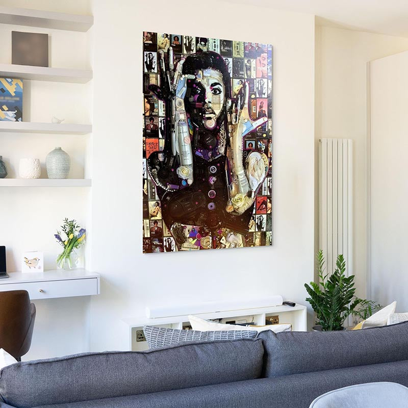 DER Zusammengesetztes Gemälde eines Prinzenporträts ist ein Kunstwerk, bei dem jedes Detail wichtig ist. Sorgfältig ausgewählte Objekte formen das Gesicht von Prince und machen dieses Gemälde zu einer faszinierenden Komposition, die mit jedem neu entdeckten Detail den Blick auf sich zieht. Jedes Element erzählt einen Teil seiner Geschichte, sei es durch Verweise auf seine Alben, seine legendären Outfits oder sogar Gegenstände, die mit seiner musikalischen Welt verbunden sind.