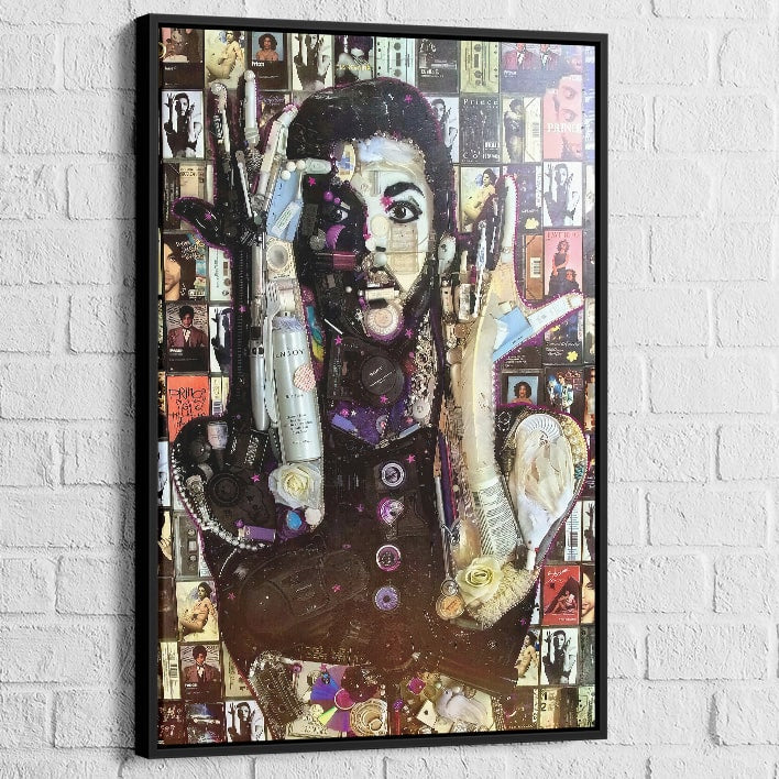 DER Zusammengesetztes Gemälde eines Prinzenporträts fängt nicht nur das Image von Prince ein, sondern erzählt eine Geschichte anhand einer Vielzahl von Objekten und Elementen. Kleine Details, wie visuelle Hinweise auf seine Alben, Instrumente und Accessoires, verschmelzen zum Gesamtbild des Künstlers. Dieses Gemälde geht über die traditionelle Kunst hinaus, indem es die Essenz eines ikonischen Künstlers in einem Werk einfängt, bei dem jedes Detail zählt.