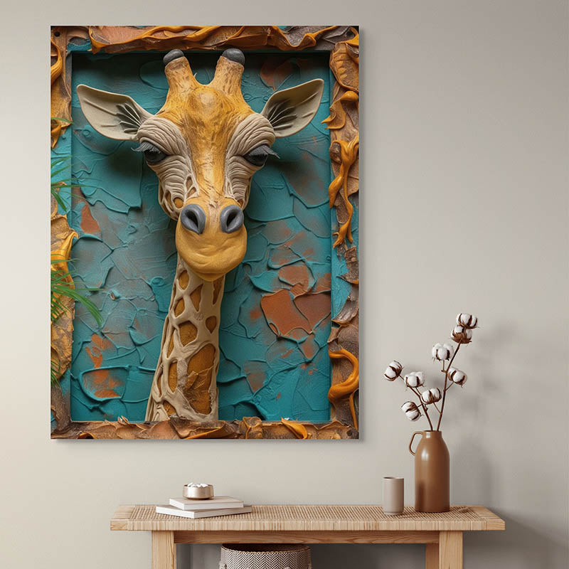 Dieses 3D-Gemälde ist nicht nur eine Illustration, es ist eine echte Wandskulptur. Das Relief der Giraffe erzeugt eine Tiefenillusion, die die Aufmerksamkeit auf sich zieht und die Neugier weckt. Es ist das perfekte Stück, um zum Mittelpunkt Ihrer Dekoration zu werden. -