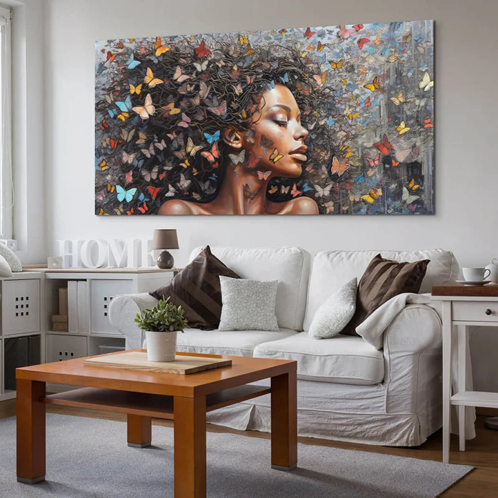 Aktuelle Wanddekorationstrends bevorzugen kräftige, farbenfrohe Stücke, die einen ganzen Raum verwandeln können. Mit dem Tisch "Melodie der Flügel", verleihen Sie Ihrem Raum eine künstlerische und lebendige Note. Die komplizierten Details der Schmetterlinge und der sanfte Gesichtsausdruck der Frau ziehen die Aufmerksamkeit auf sich und schaffen gleichzeitig eine beruhigende und inspirierende Atmosphäre.