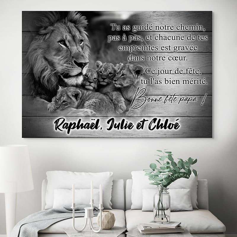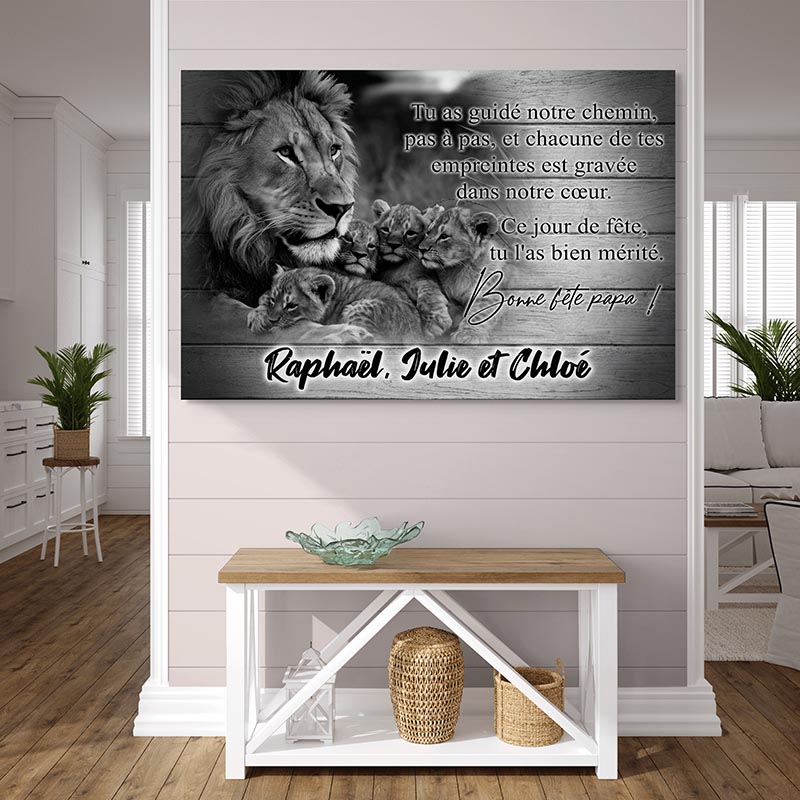 Dieses Gemälde, das eine berührende Szene einer Löwenfamilie darstellt, symbolisiert Schutz, Liebe und väterliche Führung. Die aufwendigen Details und die gefühlsbetonte Darstellung machen dies zu einem eindrucksvollen Mittelpunkt für jedes Zuhause. Es kann mit bis zu sechs Vornamen individuell gestaltet werden und ist die perfekte Lösung, um Ihre eigene Familie und die einzigartigen Bande, die Sie verbinden, zu feiern.