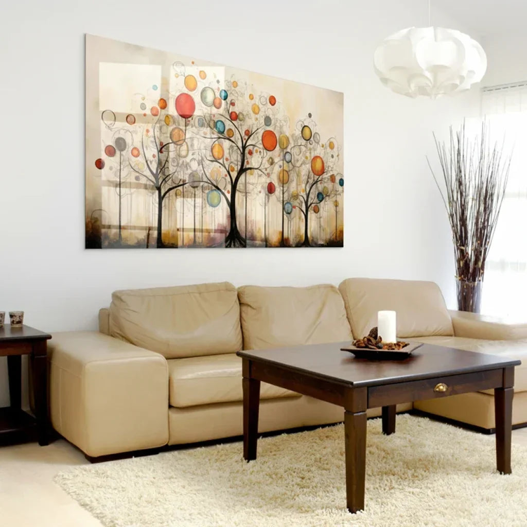 Dans ce tableau, les arbres forment une forêt délicate où le dessin fin contraste avec les sphères lumineuses aux teintes orange, rouge, turquoise et beige. L’ensemble crée un équilibre parfait entre modernité, nature et abstraction. L’effet légèrement brumeux en arrière-plan apporte une sensation de calme, comme si la scène était figée au cœur d’un rêve.