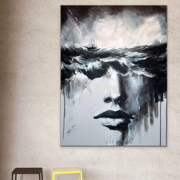 Welcome to our detailed product sheet for one of our most intriguing and captivating paintings: "The Woman of the Sea". This exceptional work of art represents the fusion of a woman's face with the sea, lightning and a sailboat, all in subtle shades of gray, white and black. The painting is a poetic expression of the strength, beauty and complexity of nature and femininity.