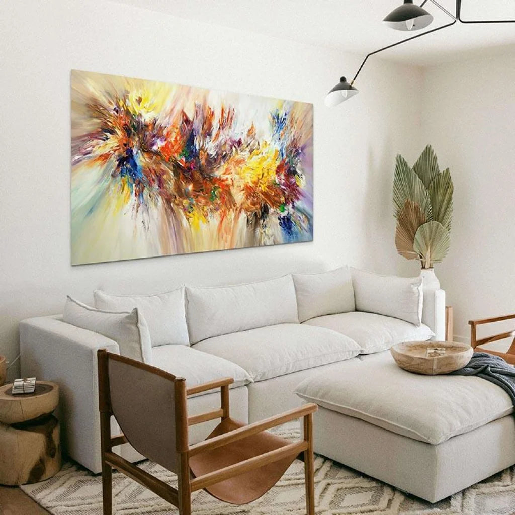 Choosing to add an abstract painting to your wall decor is a way to stand out and assert your taste for modern art. The "Explosion" painting is a unique piece that draws the eye and sparks curiosity, thanks to its vivid colors and bold aesthetic. Whether hung in your living room, bedroom, or office, this painting will be the focal point of your space and a conversation starter for your guests.