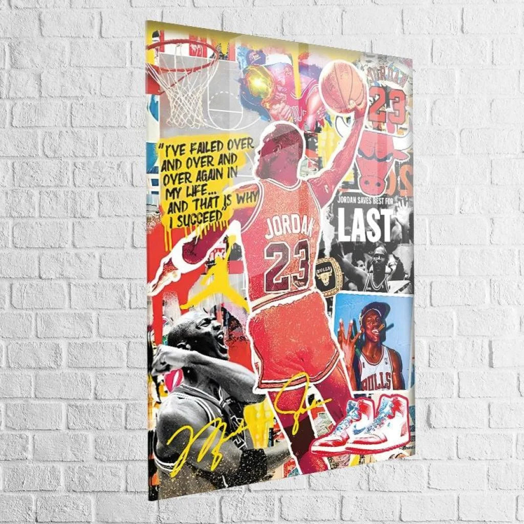 A canvas that tells the story of a champion who defined an era. Vibrant colors against a backdrop of inspiring quotes capture Michael Jordan's intensity and perseverance, inviting you to surpass yourself with every glance.