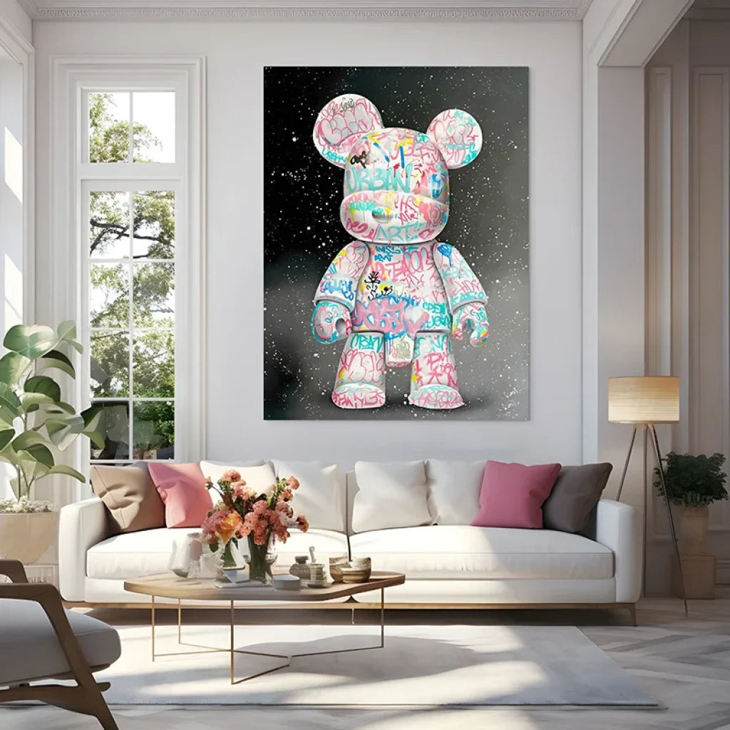 Discover "Urban Expression", a bold Street Art painting that embodies the lively and rebellious spirit of urban graffiti. This unique piece features a stylized figure inspired by the famous collectible toys, covered in colorful graffiti, which brings a contemporary and avant-garde touch to any living space.