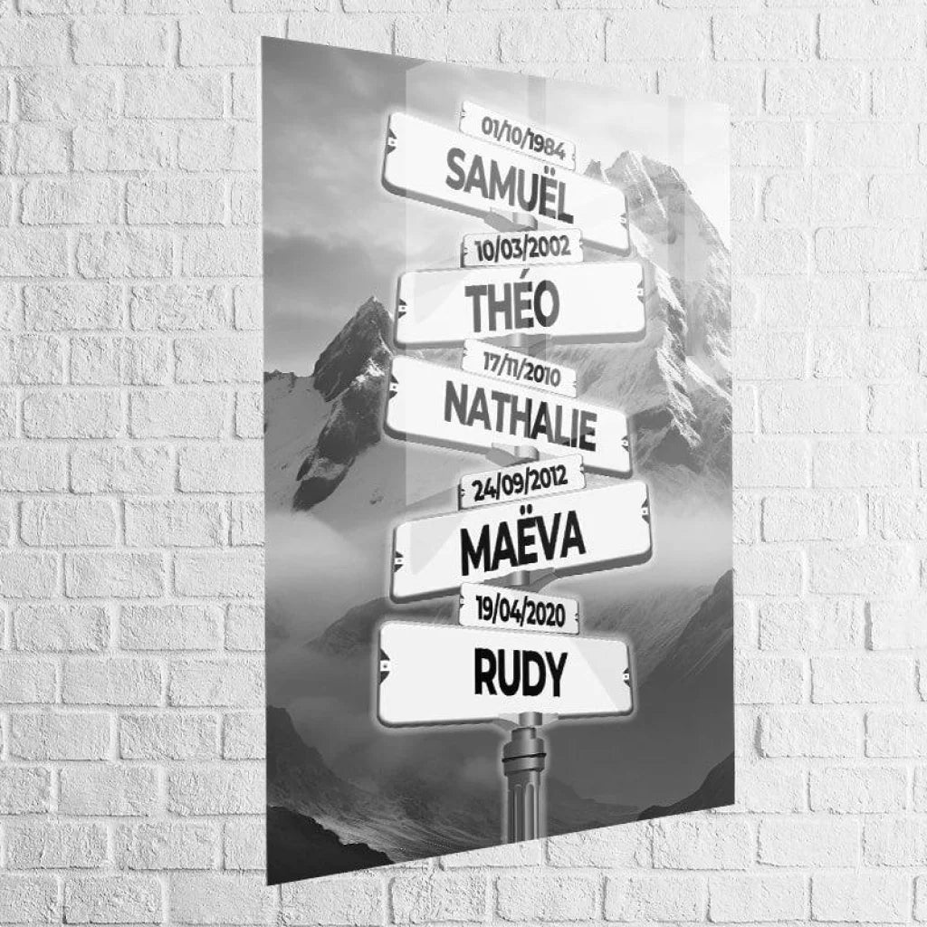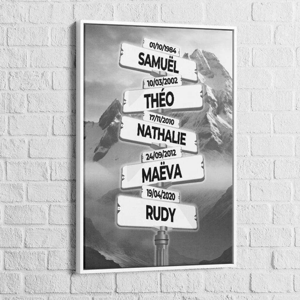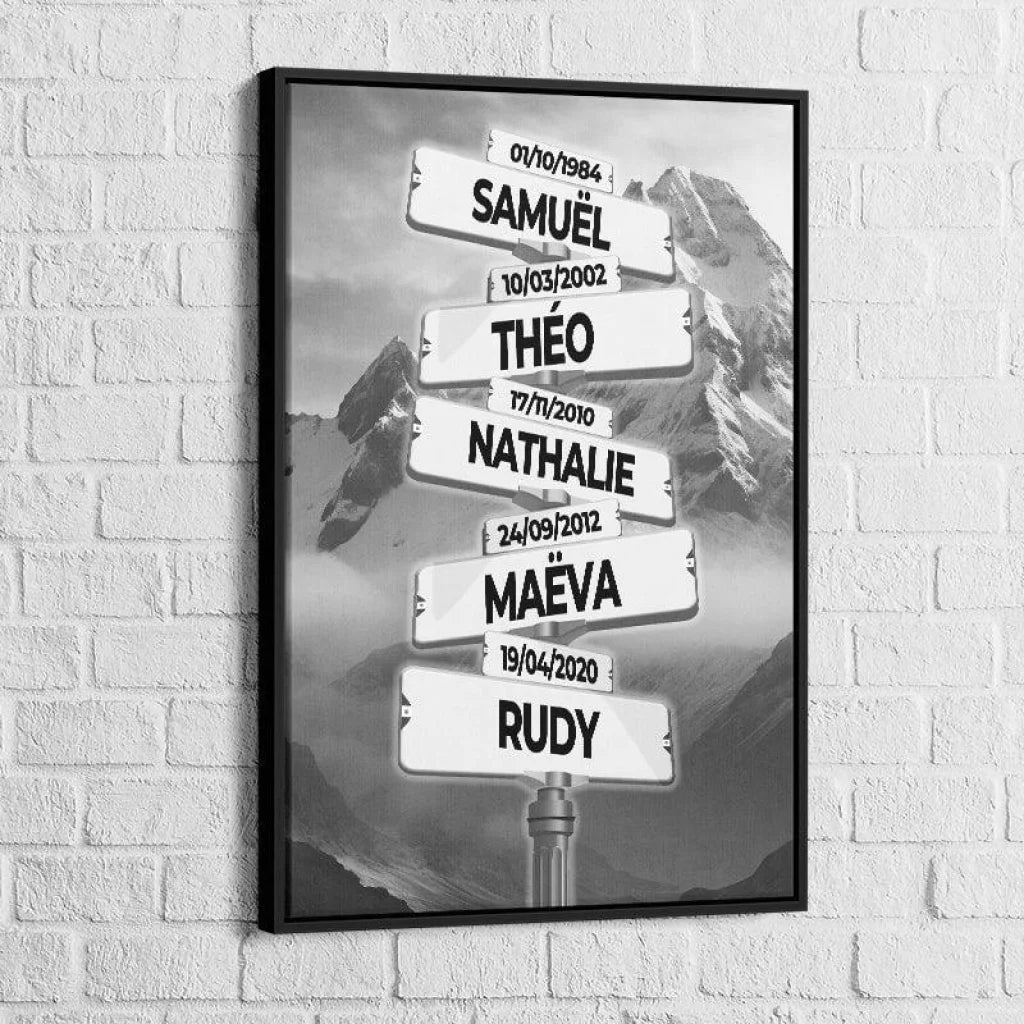 The image evokes a hiking trail in the heights, symbolizing each person's life journey. It is a powerful metaphor for the summits reached together and the individual journeys that each person undertakes. Ideal for commemorating birthdays, unions, births or simply celebrating family unity, this personalized painting becomes more than a decorative element: it is a legacy, a pictorial story that will cross generations.