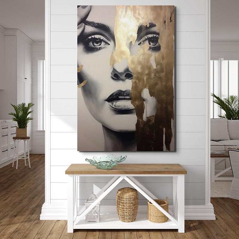 Elevate your interior decor with the Modern Painting Aura of Glamour, a striking canvas combining golden hues with a contemporary black and white design. The delicate combination of realistic details and golden touches creates a Contemporary canvas that exudes mystery and charm. Every facial feature in this artwork exudes elegance, while splashes of gold add a subtle sheen. Carefully framed, this painting has a visual impact powerful that transforms any space into an artistic sanctuary.