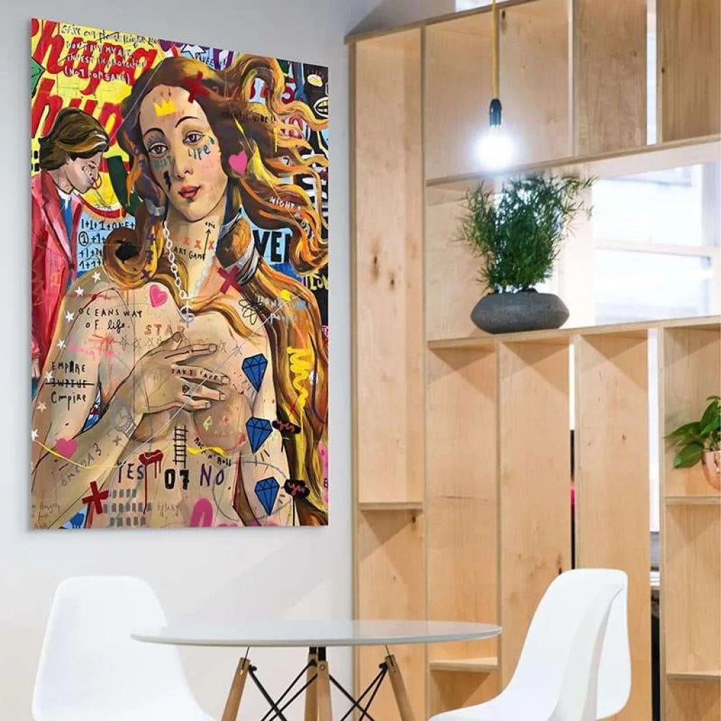Sumérgete en el vibrante mundo de "Symphonie Pop", una pintura de arte callejero que reúne elementos de la cultura popular y el arte clásico de una manera audaz e innovadora. Este Lienzo de arte callejero colorido es una celebración del arte urbano, que muestra una mezcla dinámica de patrones e íconos que hablan al observador moderno. Con su impacto visual Sorprendente, "Pop Symphony" es mucho más que una simple Decoración de pared ; Es una declaración de estilo que aporta nueva energía y carácter expresivo a cualquier espacio. Ofrecido en Lienzo impreso en gran formatoEsta obra es accesible a cualquier persona que quiera dinamizar su entorno con una pieza que sea a la vez contemporánea y asequible.
