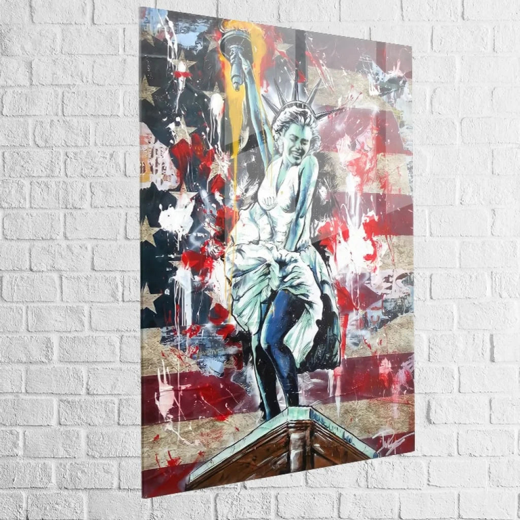 Con esta imagen impactante, Marilyn Monroe se convierte en la nueva Lady Liberty, símbolo de audacia y libertad, en un universo americano desestructurado y colorido.