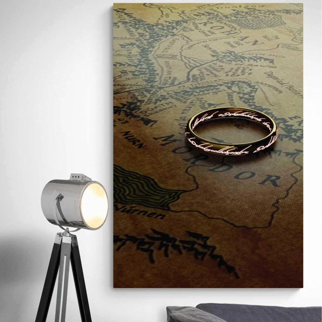 Este cuadro, disponible en varios formatos como póster sin marco, lienzo tensado, marco flotante en blanco o negro y plexiglás, está diseñado para adaptarse a todos los espacios y estilos de decoración. Cada detalle del Anillo Único se reproduce con exquisita precisión, reflejando luz y sombra, evocando la dualidad de su poder, a la vez seductor y corruptor.