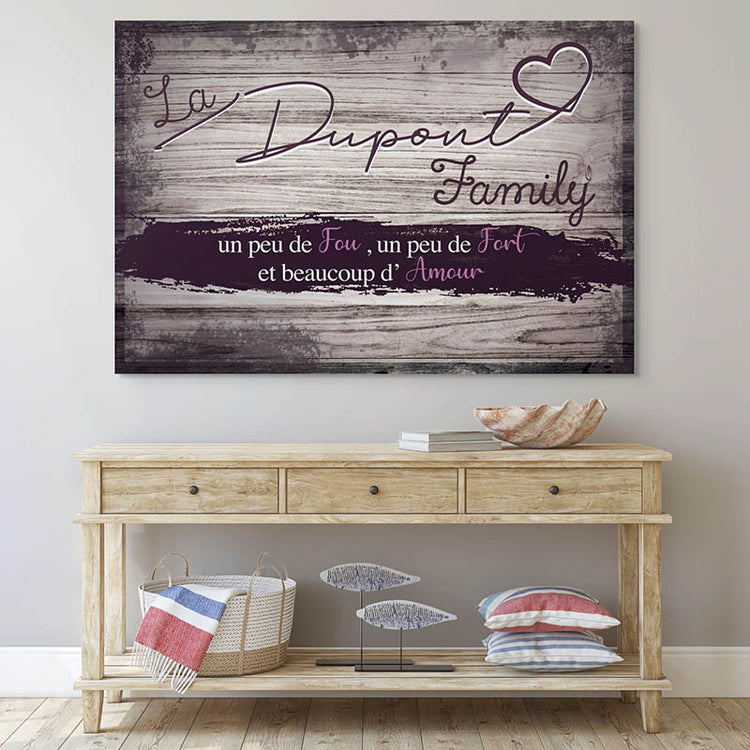 Le Tableau Personnalisé Family est bien plus qu'une simple décoration murale. Il incarne les valeurs et l'esprit de votre famille, immortalisés à travers un design élégant et personnalisé. Vous avez la possibilité d'inscrire votre nom de famille, ainsi que des phrases qui reflètent parfaitement votre cocon familial, comme celle-ci : "Un peu de fou, un peu de fort et beaucoup d'amour". C’est une manière charmante de mettre en avant ce qui rend votre famille unique tout en ajoutant une touche chaleureuse à votre intérieur.