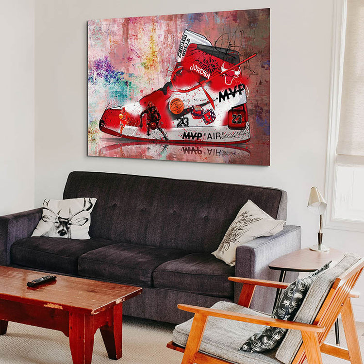Le tableau Air Legend est bien plus qu’une simple œuvre, c’est un hommage vibrant à l’une des plus grandes légendes du basketball. Inspiré de l’énergie brute du street art et de la culture urbaine, il combine puissance visuelle et symboles emblématiques du jeu.