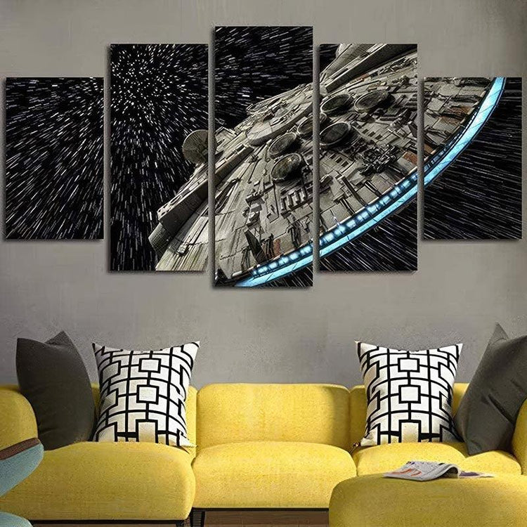 Si vous êtes un fan inconditionnel de la saga mythique créée par Georges Lucas, vous ne pouvez pas passer à côté de cette toile ! Ceux qui suivent les aventures de Luke Skywalker, Han Solo, Chewbacca et R2D2 auront reconnu le Faucon Millenium qui s’affiche fièrement sur cette collection de 5 toiles.