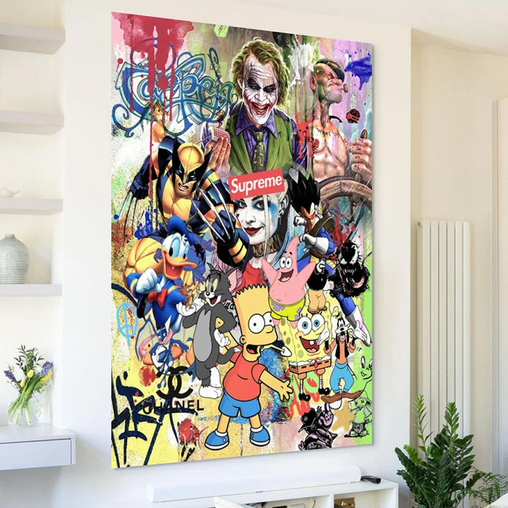 Ce tableau met en scène un mashup détonant où se côtoient héros de comics, personnages d’animation culte et références à la culture urbaine. Un condensé d’influences qui célèbre l’art du crossover et du graffiti.