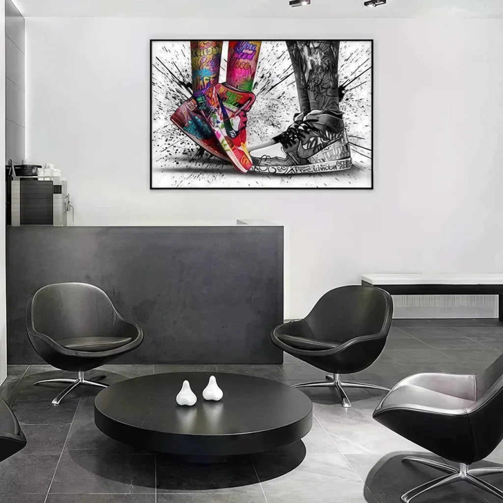 Con questo street art pittura scarpe Nike, porti l'autenticità e il dinamismo della street art nel tuo spazio. Si tratta di un'opera che sfida le convenzioni e invita alla riflessione, perfetta per chi desidera aggiungere un elemento distintivo al proprio arredamento.