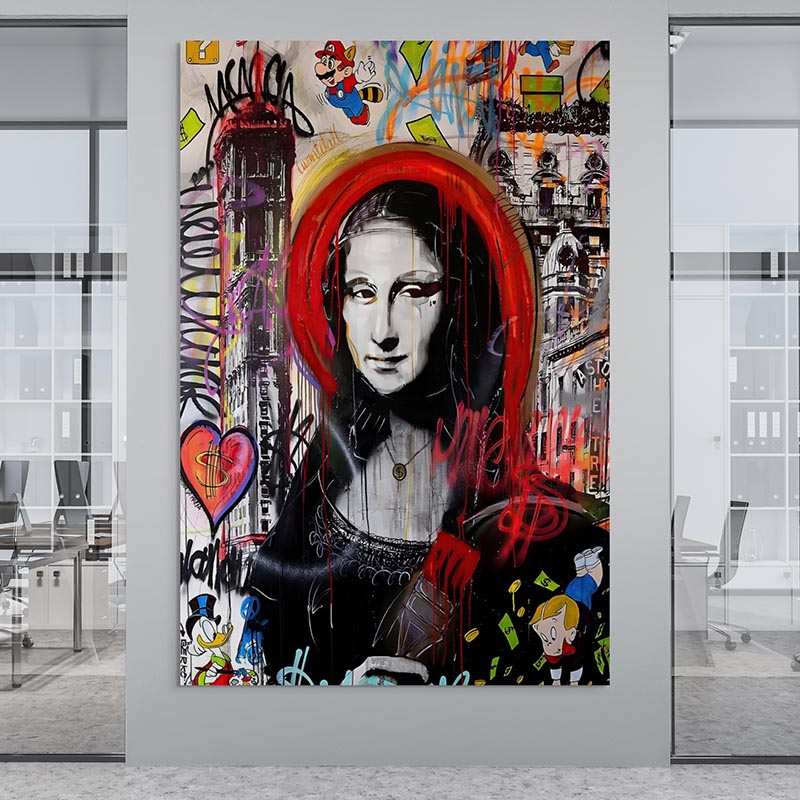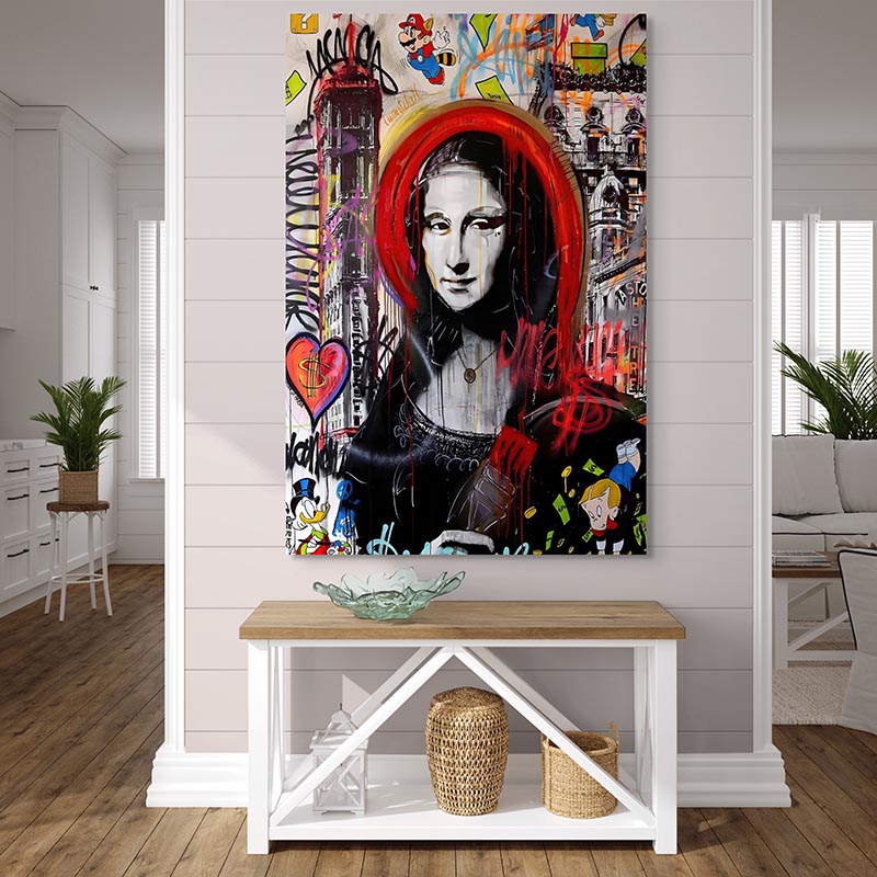 “Urban Mona” si adatta bene a molti stili di arredamento, dal moderno al classico, grazie al suo mix unico di motivi antichi e moderni. Si adatta perfettamente a vari ambienti, offrendo una rara adattabilità per un pittura di arte di strada.