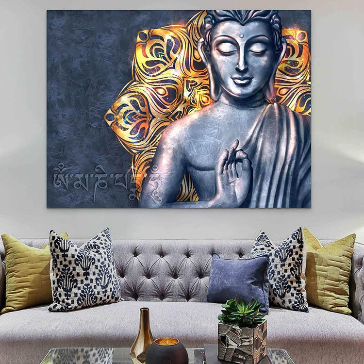 E Buddha Molerei ass méi wéi nëmmen en dekorativen Element. Et reflektéiert dës Wäerter a kann hëllefen e Raum fir Entspanung a Meditatioun an Ärem Heem ze kreéieren. Dëst besonnescht Bild, mat sengen Téin vu blo, violett a Gold, kann e Pop vu Faarf op Äre Raum addéieren, wärend dee berouegende Effekt nach ëmmer behält.