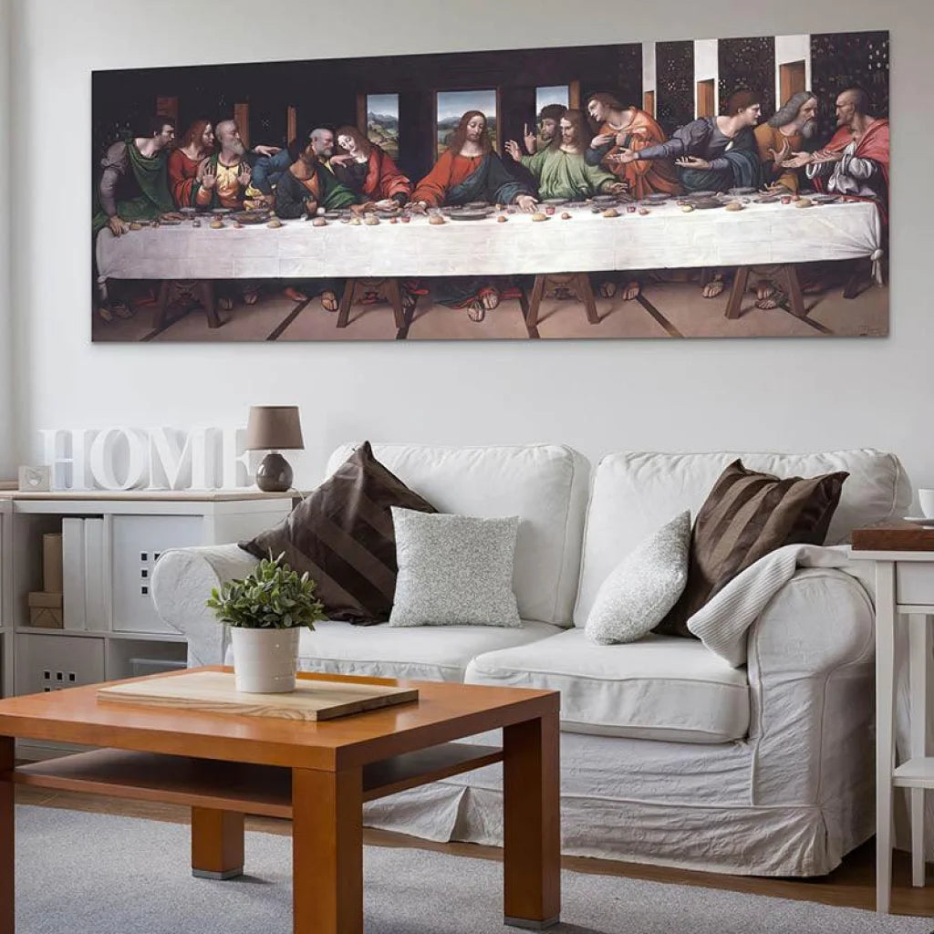 Fir sech u verschiddene Plazen a Virléiften unzepassen, bidde mir eist Bild "The Last Supper" an zwou Dimensiounen: 20x60 cm fir méi kleng Plazen an 90x180 cm fir méi grouss Plazen. Béid vun dësen Optiounen erlaben dëst Meeschterstéck an Ären Interieur ze passen, egal ob Dir et iwwer engem Canapé wëllt hänken, an enger Gang oder an engem grousse Raum.