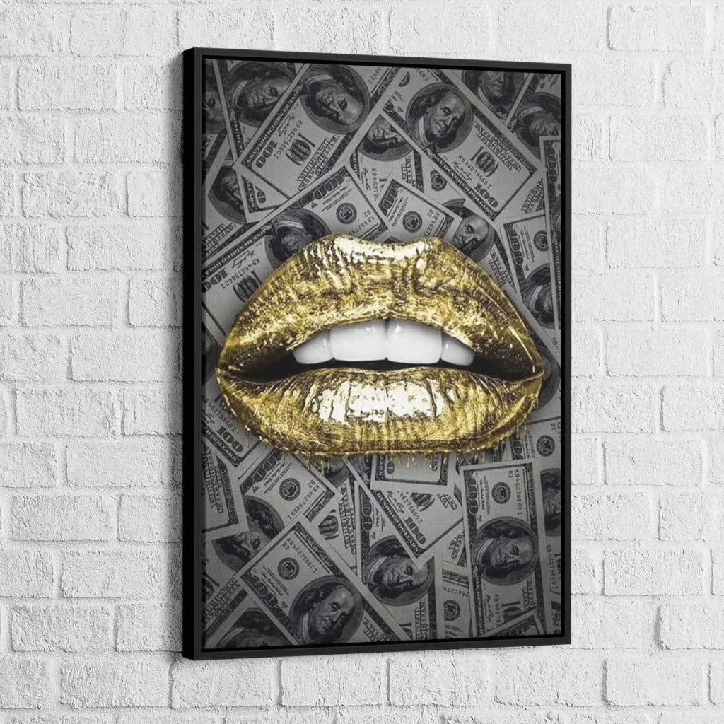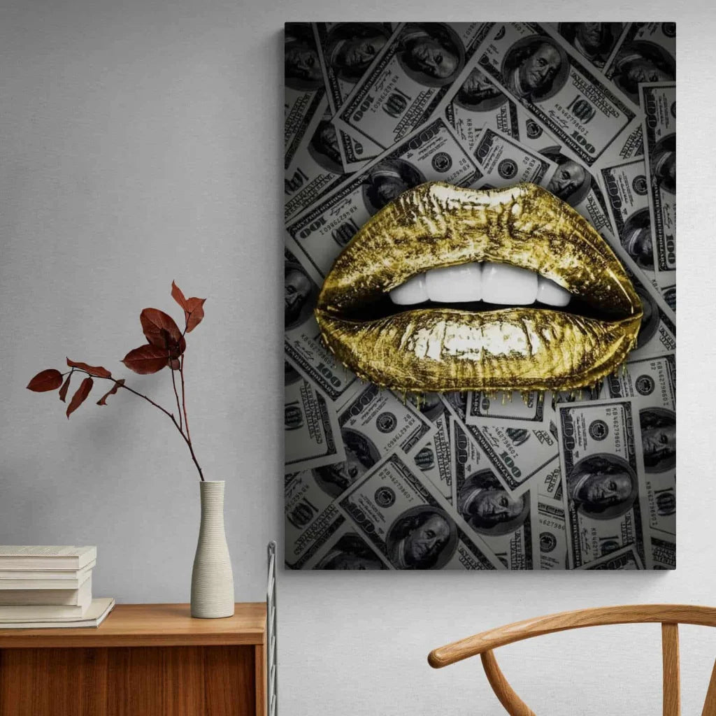 Dëst glänzend Bild ass e ganz dekorativen Objet. Obwuel den Hannergrond vum Canvas en Teppech vun Dollar duerstellt, deen hei an do verstreet ass, op deem mir e sensuellen a gëllene Mond gesinn. Dësen hallef oppene Mond mat wäiss Zänn a Lëpsen am Gold gemoolt mécht dëst Leinwand eng Dekoratioun räich u Sensatioun.
