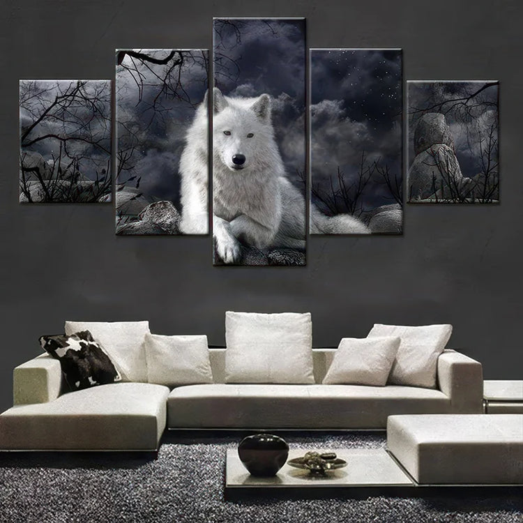 Dëst 5-Panel White Wolf Molerei ass wierklech e Wonner. Also, wann Dir eng bestial Dekoratioun hutt, ass et sécherlech Richtung dëst Bild dat Dir sollt dréien!