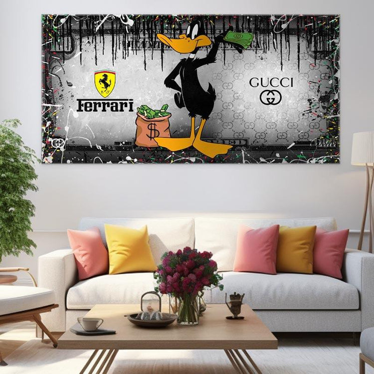 Eis Daffy Ferrari Street Art Canvas verkierpert déi perfekt Fusioun tëscht ikonescher Animatioun an der Welt vum Automotive Luxus. Et ass e richtegt Feier vu Geschwindegkeet, Moud an Humor, bitt oniwwertraff Dynamik un all modernen Interieur.