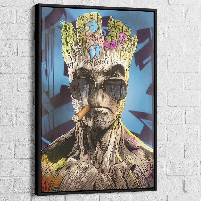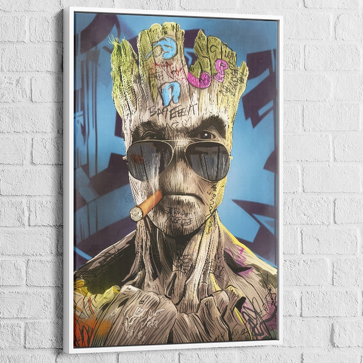 Entdeckt dëst originellt Bild mam Groot, dem ikonesche Charakter aus Guardians vun der Galaxy. Revised an engem Stil Strooss Konscht Modern, dëst Wierk weist Groot mat Sonnebrëller an enger Zigare, ëmgi vun helle Faarwen a Graffiti. Eng perfekt Fusioun tëscht dem Marvel Universum an der urbaner Konscht fir en Touch vu Charakter op Är Maueren ze bréngen!
