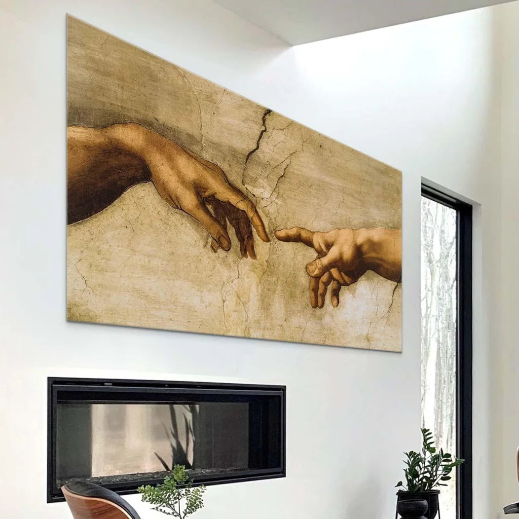 Dëst Bild ass Wandkonscht, déi dem Michelangelo säi berühmte Fresko op der Plafong vun der Sixtinesch Kapell am Vatikan weist. Besser bekannt als " D'Schafung vum Adam ", dëse Fresko ass e richtegt Konschtwierk. D'Bild ass inspiréiert vum Buch Genesis no bibleschen Texter. Et weist dem Gott säi Zeigefanger, deen dem Adam säi Zeigefanger bäitrieden, ouni ze beréieren, fir dem Mënsch Liewen ze ginn. Dëst Bild deelt déi selwecht Symbolik a Charme wéi d'Original.