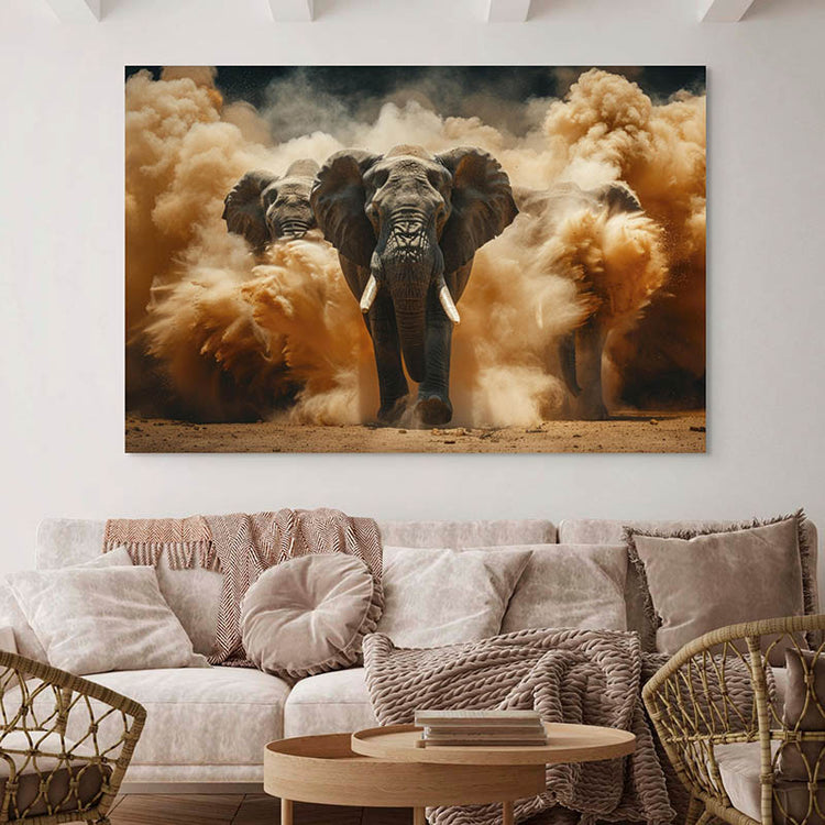 Cette scène photoréaliste d'un éléphant en pleine charge, soulevant des nuages de poussière, donne une impression de mouvement et de puissance. Les détails incroyables de l’image apportent une sensation de réalisme et de profondeur à n’importe quel espace. Vous pouvez presque entendre le rugissement du vent et ressentir la force de l’animal.